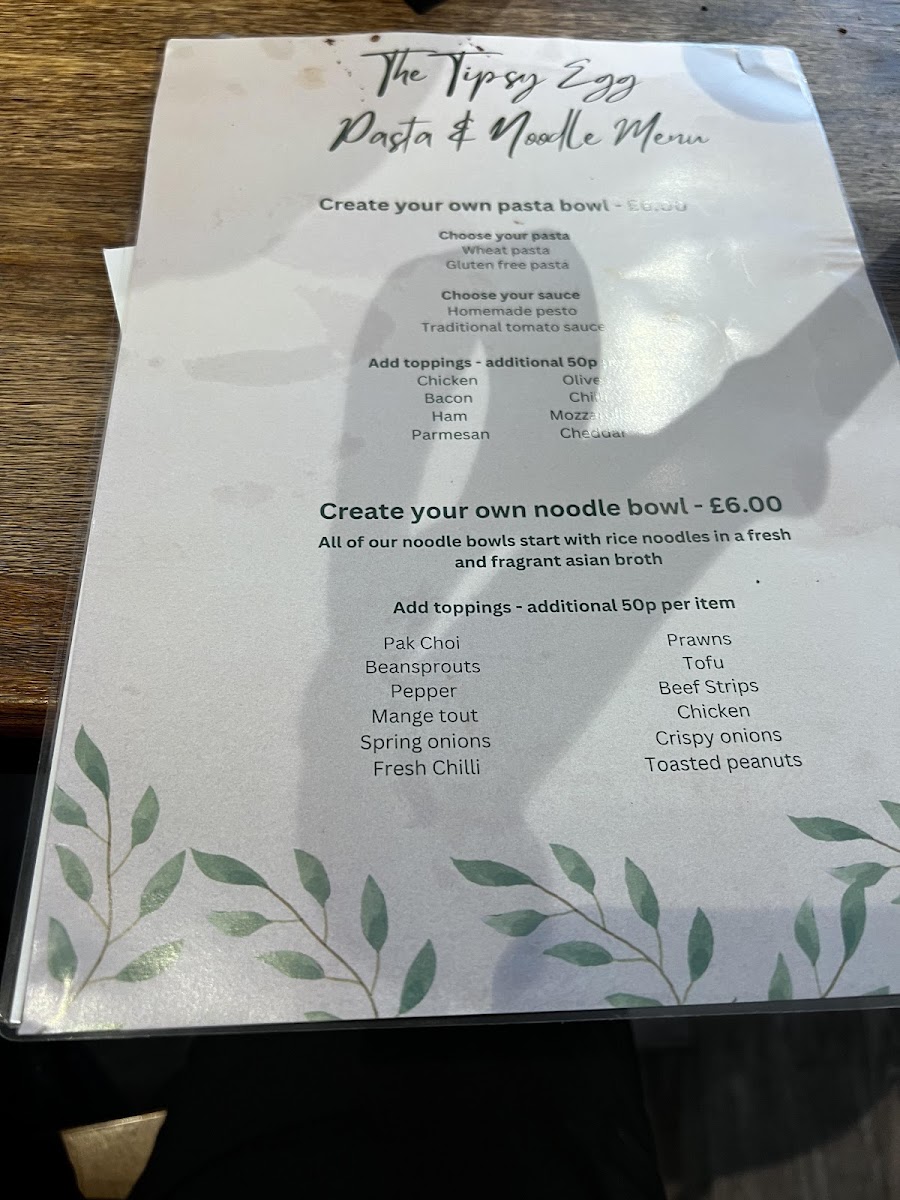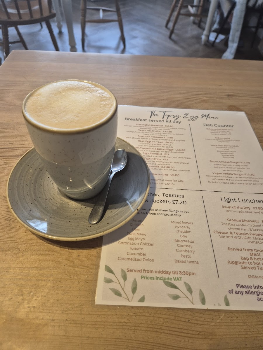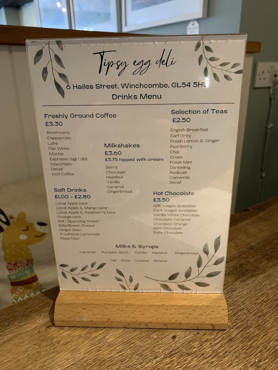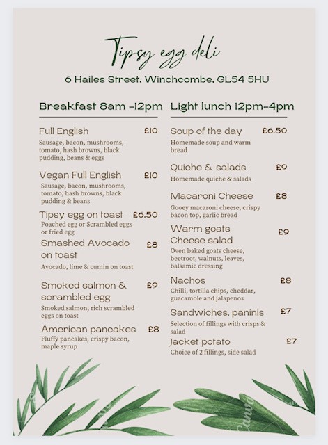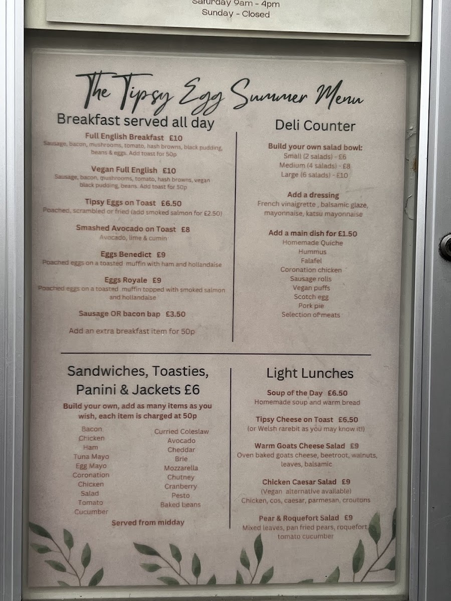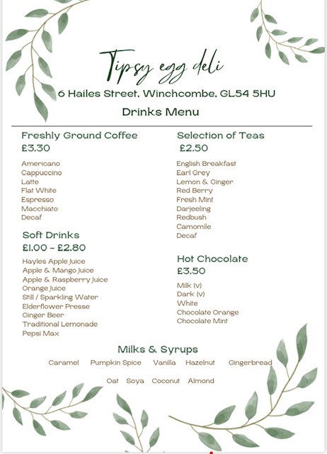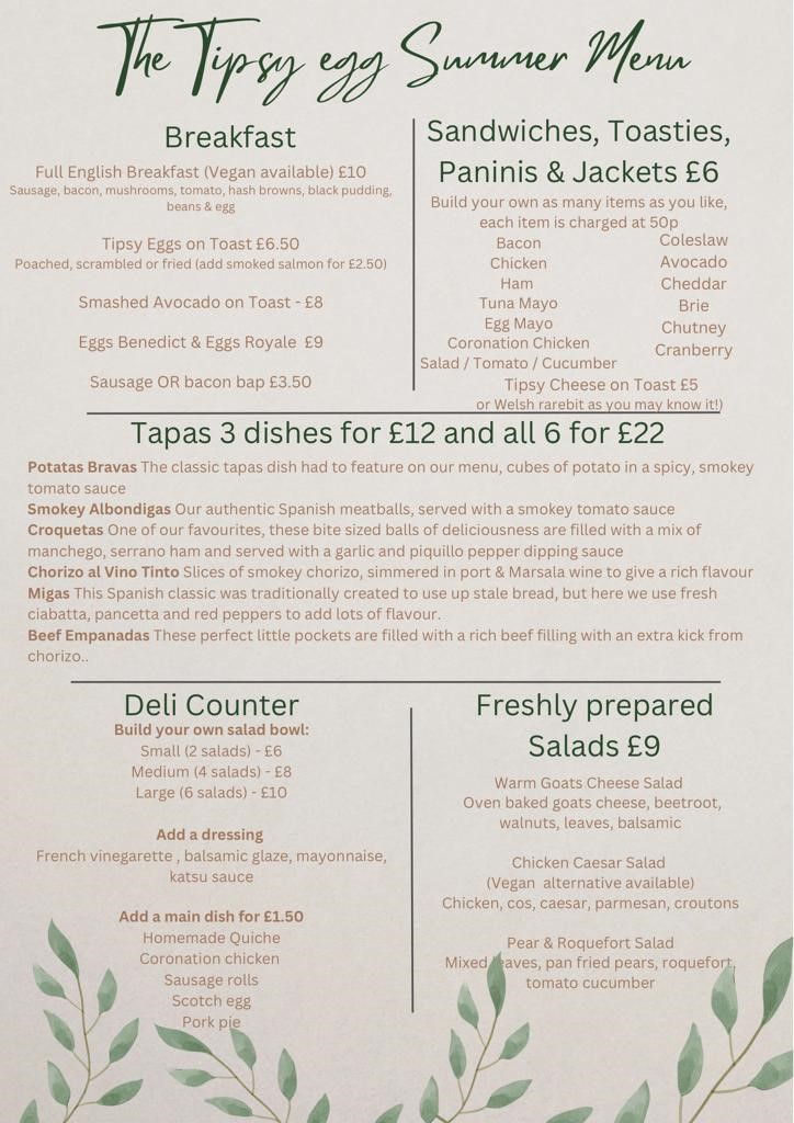 The menu at The Tipsy Egg offers a delightful variety of breakfast and lunch options with something for everyone. For breakfast, you can enjoy a hearty Full English Breakfast or lighter options like Tipsy Eggs On Toast or Smashed Avocado On Toast. If you're in the mood for something more indulgent, the Eggs Benedict and Eggs Royale are excellent choices, along with a simple yet satisfying Sausage or Bacon Bap. Their deli counter allows you to build your own salad bowl or sample classic snacks like a Scotch Egg or Pork Pie. Tapas enthusiasts can savor Potatas Bravas, Smokey Albondigas, and Croquetas, or try Chorizo Al Vino Tinto and Migas. For a lighter meal, opt for one of the Freshly Prepared Salads like the Warm Goats Cheese Salad, Chicken Caesar Salad, or the tangy Pear & Roquefort Salad. A refreshing selection of Teas is available, including English Breakfast, Earl Grey, and Chai, alongside a variety of Syrups & Milks like Cinnamon, Vanilla, and Hazelnut. For a sweet treat, enjoy one of their unique Hot Chocolate options, such as Chocolate Orange or Mint Chocolate. Breakfast is served all day, with options like the Vegan Full English or American Pancakes. If you're craving a light lunch, the Soup of the Day, Croque Monsieur, or a classic Cheese & Tomato Omelette are all great choices. The coffee menu features freshly ground favorites like Americano, Cappuccino, and Flat White, while soft drinks and milkshakes offer refreshing alternatives.